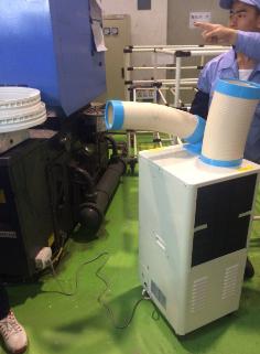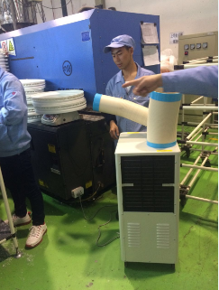 客户诉求:夏季时电器注塑部件区域由于机器内部也会产生大量热量,局部温度会达到40℃以上,操作工人急需降温防暑设备。