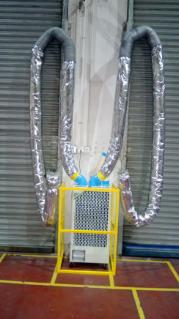 解决方案:使用冬夏SAC-45开云手机在线登陆入口机型,制作6米长冷风延长管,利用滑轨在装箱时把冷风管通到车厢内,进行整体降温,改善箱体内工作环境。